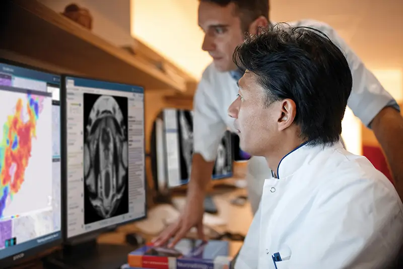 Und wie sieht es bei KI in Diagnostik und Therapie aus? Die Möglichkeiten sind ohne Zweifel immens, betont Professor Herborn. „Es gibt zahllose gute Ansätze; vor allem Radiologie, Pathologie und Dermatologie können enorm von KI-Lösungen profitieren. Spannend finde ich zudem eine sprachbasierte Früherkennung von Menschen mit Risiko für Morbus Parkinson oder Diagnostik über eine Irisanalyse – in beiden Fällen existieren KI-Modelle, die exzellente Ergebnisse liefern können.“ Herborn vergleicht die Modelle mit dem Autopiloten beim Flugzeug, dem man sich heutzutage ganz selbstverständlich anvertraut. „Der menschliche Pilot ist in der Regel nur bei Start und Landung sowie bei schweren Turbulenzen gefragt. Warum sollte dies bei der einen oder anderen medizinischen Tätigkeit mittelfristig anders sein?“